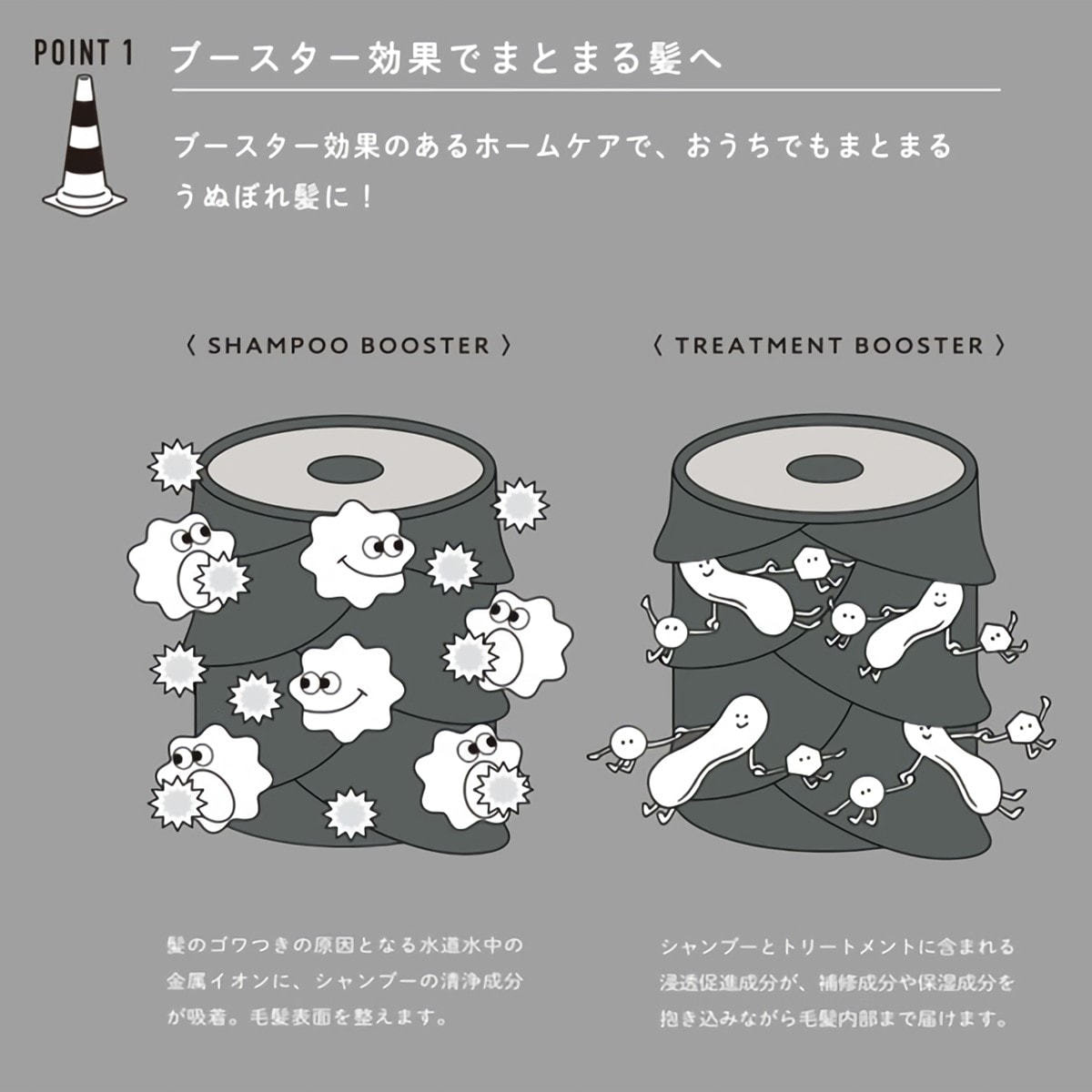 ブースター効果でダメージを毛髪外部から内部へとケアし、根元から毛先までおさまりのよい髪へと導きます。